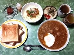 今日の夕食はスープカレー、卵、納豆サラダ、お新香、スープ、トースト、日本茶、菓子、ジャム、乳酸菌飲料。スープカレーは肉団子とレンズ豆と人参と玉ネギとジャガイモと大根とキャベツとキクラゲとニンニクの辛口で、目玉焼きを添えて。納豆サラダはキャベツと大根とフライドオニオンを入れてマヨネーズで。お新香は白菜と福神漬け。スープはワカメとネギと煮干し。トーストはキツネ色に。デザートはディズニーの菓子とハッサクのマーマレードと乳酸菌飲料。朝は2時間ほど朝寝坊。今日は朝から雨。のんびりと朝食を取ってから、PCとガイドブックで情報の収集。考えがまとまらないのでオリンピックを見ながら昼飯に。雨も止んでいる様なので、自転車で駐車場の方に。家に帰ってからは引き続きガイドブックとにらめっこ(・_・、)取りあえず夕方までには宿の手配が済みました。旅行の計画で一日を潰したピョンタでした。