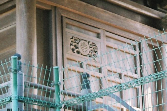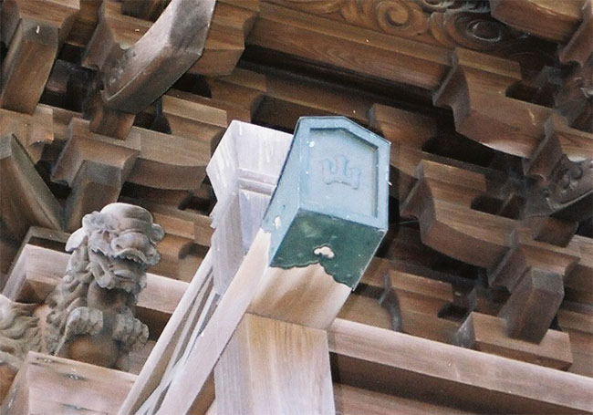 こちらは、本殿の構造部に確認できた紋。『山』の一文字である。
