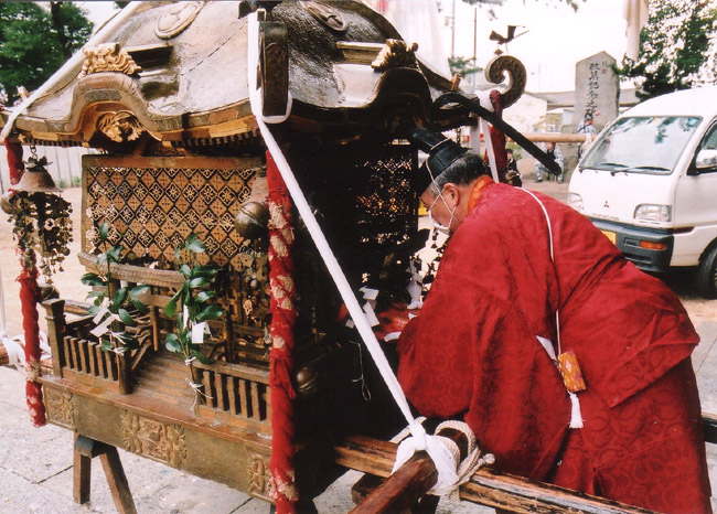 こちらは、お御輿に入った紋。『丸に山』と『右三つ巴』が確認できる。