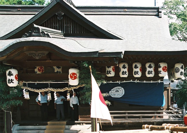 拝殿の幕に入っている紋は、提灯と同じ『丸に山田』の紋である。提灯には『右三つ巴』の神紋も入れられている。