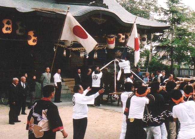 お御輿を担ぐ人の背中にも、お御輿と同じ『丸に山』の紋が入っている。