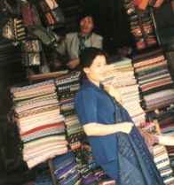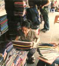 | 一番左は仏像屋さん。そして、その前で楽器を演奏する人達。 仏像は、手のひらサイズのものから、きちんと彫り上げた腰丈くらいのものまで、素材や色も様々だ。緑の翡翠のものが高級そうだったが、個人的には木彫りの方が気に入った。カンボジアらしい、くねるような動きをとっているものが多い。楽器は小さくて丸い弦楽器。ニ、三本の弦を細い木の枝のような弓で弾いている。 右二つは、クローマーとサンポットを売っているお店。クローマーはスカーフ状の布で、こちらでは首やら頭やら色々なところに巻く、欠かせない布だ。両端が解いてあって、襟巻きのよう。サンポットは円筒状の腰巻。売り子のお姉さんが、しきりに「スカート、スカート」といいながら見せてくれた。迂闊にじっとしていると、すぐに腰に巻いてくれる……。どちらも色柄ともに豊富。折柄も派手すぎず、センスがいい。山のように積んである布地は殆ど同じ物がないので、好きなのを選び出すのが大変だ。どれを見てもかわいい。時間がいくらあっても足りないのでパパッと勘で何枚か選び出して買う。英語は殆ど通じないので、なんとなく身振りで会話(笑)。何枚欲しいかを告げると、お姉さんも一緒になって何枚も生地を並べ、一緒に選んでくれる。「こっちのほうが似合うわよ」みたいな顔で、胸の辺りにあててみたり。(笑)そんなやり取りがまた楽しいのだ。一生懸命頼み込むと、かなりまけてくれる。 後で他の観光地に寄ったが、ここが一番安かった。アンコールワット付近の土産屋では四倍近い値段もあってびっくり。。(それでも、アンコールワットだけに旅行に来ている人達は、せっせと買っていた。当たり前だが…)「もっと沢山買えばよかった〜!」と後で後悔……。 |