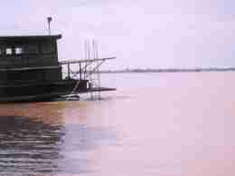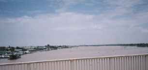 | 昼食の後にメコン川を眺めに行く。 上は車窓から眺めたメコン。橋の上から両端を入れて撮ったもの。 下は水辺から向こう岸を。寂れたお寺の裏手辺りに車を停め、水際まで歩く。特に観光スポットという感じではなく、川の中に少し張り出した場所があって御座船もどきが浮いる。近所の子供達が水に飛び込んで遊んでいたり。その脇で、ちょっと照れながらも写真を撮った。 向こう岸が霞むほど遠い。雨季だったので水は茶色い泥水だ。乾期にはこれが真っ青になるらしいと聞き、ちょっと残念に思う。これだけの広い川が青かったらさぞ美しいことだろう……。 ガイドさんは向こう岸を指差しながらのたまった。 「あの辺り、全部今洪水ね」 こ、洪水!? 「もう何週間も水ひきません」 それって、かなり酷いんじゃあ……と思ったのだが、この国では普通らしい…。雨季=水没は当たり前。シェムリアップに行ってから、きちんと高床式に造られている家屋たちを見て納得。 |