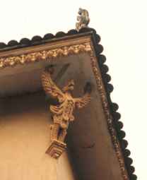 屋根を支えているかのようなガルーダ(インド神話の怪鳥。ヴィシュヌ神の乗り物)の彫刻。 |