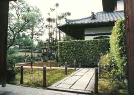 | 常設の拝観寺院のひとつで、いつでも見ることができる寺だ。だが、何時訪れても「いいなあ」と思える見事な庭だと思う。丁寧に手入れされ尽くしている気がする。特に真冬の寒い時期……誰も拝観客がいない時に訪れるのが好きだ。季節を選ばないタイプの庭園だからだろうか。風魔は何も考えずに(特に目当てもなく)京都に来るとついつい、しつこく訪れてしまう場所だ。 門外も一つの絵になる。外門へ至るまでの道(大仙院と真珠庵に通じる)は両脇にまっすぐに背の高い松が並んでいる。太くも細くもなく、有名寺院へ続いている割に静かだ。そして、表門前に配されている一本の松の木が見事だ。背は低く、四方へと長く枝を張り巡らせている巨木だ。枝も葉も荒れた様子がなく元気で青々としている。拝観しない人でも見られるので、ここまでちょっと足を伸ばして見て欲しい。 |