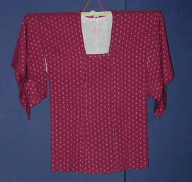 冬用道中着。もっとパッとした朱だったのですが、上に緑色をかけて、落ち着かせました。冬の寒い日は助かります。 |