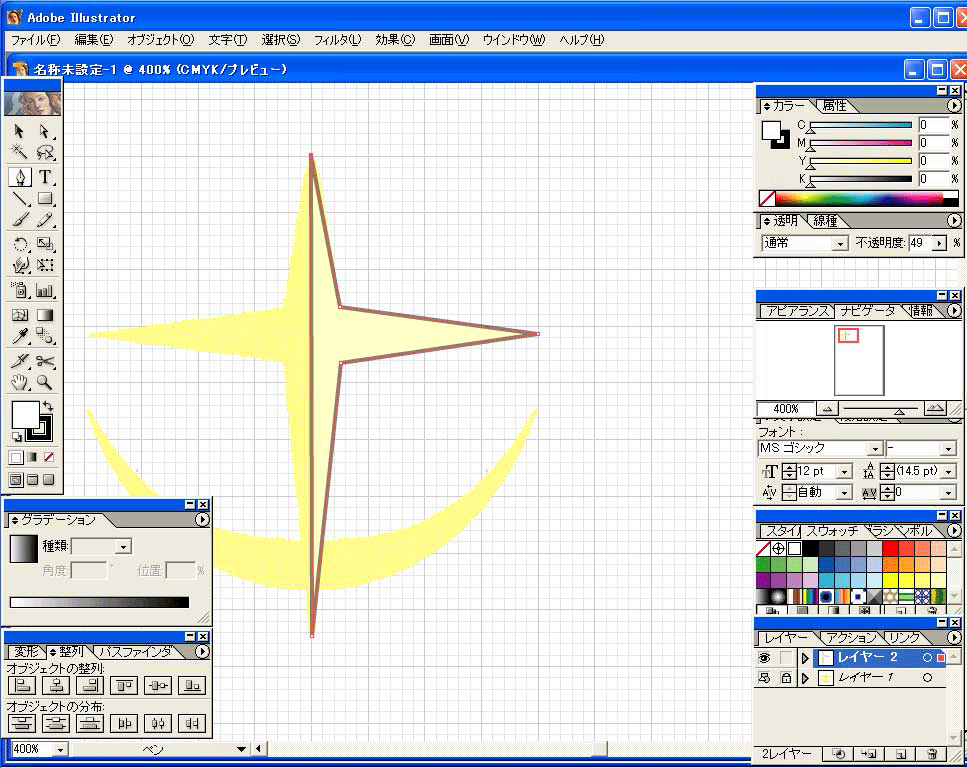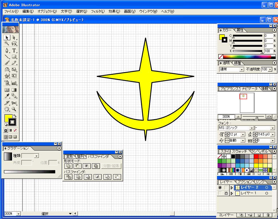 出来上がった十字と弧(?)を配置し、パスファインダで形状エリアに追加を押し、二つの図形をひとつにします。こうすることにより、縁取り線も簡単に引けます。