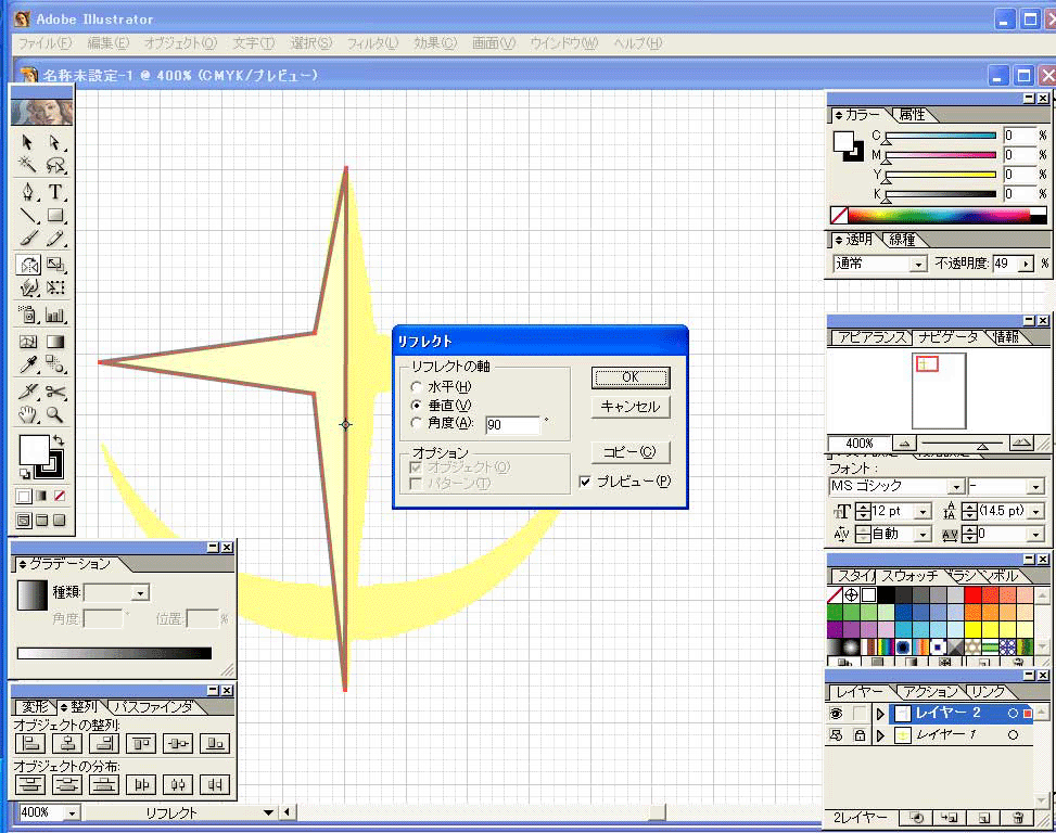 リフレクトツールを使い、作図した画像を反転コピーします。ALTキーを押しながらクリックすると簡単に座標を合わせることが出来ます。
