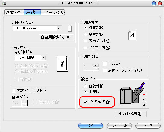 これらの設定をして、印刷を行います。必ずページ合成にチェックするのを忘れないでください。色を上乗せする際にズレが発生する原因になります。