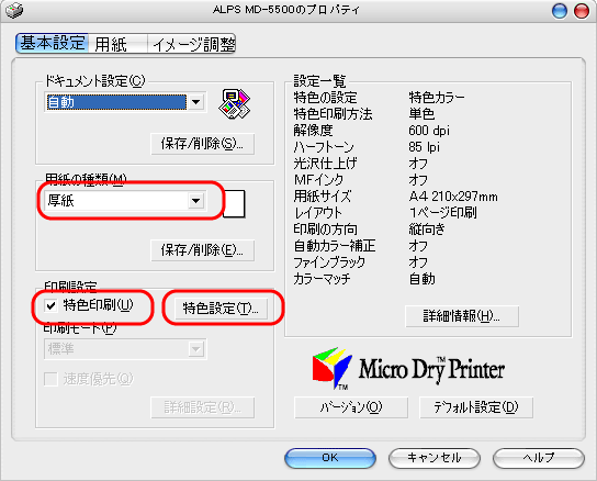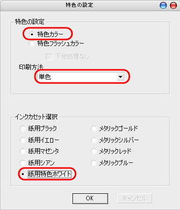 【基本設定】 用紙の種類 → 厚紙 印刷設定 → 特色印刷にチェックを入れ、特色設定から特色ホワイトを選択。 |
