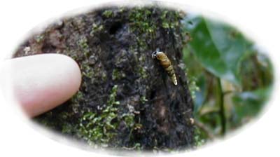 森をゆっくり歩かないと見過ごしてしまいます。茎は5cmあるか無いかです。全体が緑色でシダ類が着生している木に何気なく咲いています。 |