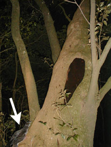 | 2.根本にはい上がる(左下に注目) 木の根本からはい上がります。このときに両足とくちばしを使って登って行きます。 2003年3月21日撮影 |