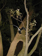 | 5.木の上から飛び立つ 木の上の開けたところまで登ります。そして風を待って飛び立ちます。 (暗くて殆ど見えませんが、白いお腹と顔を確認できます。)木の根本で木登りの順番待ちをしていることも多いですが、木の上で飛ぶ順番待ちをしている場合もあります。その場合、木の上は大渋滞になってしまいもう大変です。居心地が悪いらしく盛んに鳴き合っていることもあります。 2003年3月21日撮影 |