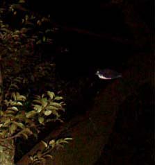 | 1.穴から這い出る オオミズナギドリがまず朝一番にやることと言えば、地面の巣穴から這い出ることです。体の右側と左側を交互に擦りあげて穴から這い出てきます。写真は這い出してきたばかりのオオミズナギドリです。まだ穴の中にいる時と同じ姿勢のまま羽を閉じて肩をすくめているのが分かります。2003年3月21日AM4:30 撮影 |