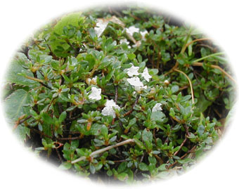 | ハコネコメツツジ 密集した小さな葉の中に白く小さな花を見つけることができるでしょう。ハコネコメツツジは御蔵島が南限となっていますが、伊豆諸島のものはイズノシマコメツツジに分化しつつあると言います。 |