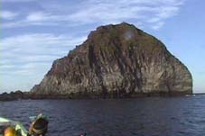 | 元根 里から見て、島のちょうど裏側にあたるところにあります。大きな島の様な岩です。元根の周辺には暗礁が沢山あり、ウォッチング船はこの暗礁の間を縫って行きます。そして元根と周辺の岩山との間は僅か数メートル程度の所もあり、早い流れもあります。ウォッチング船に乗ってこの岩の谷間を、波に乗りながらすり抜けていくスリリングな体験は、御蔵島の名物になっています。 |