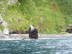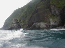 | スバリ根 最近ではスバル根と言ったりします。江戸時代に作られた日本地図「伊能図」には、この「スバリ根」や下にある「元根」が描かれ、名前が記載されています。昔、御蔵島を測量に来た伊能隊は、あまりの海の荒々しさに船が島に辿りつけずに漂流してしまったりして大変だったそうです。さすがに老年の伊能忠敬は自分で測量に来るのをあきらめたと言います。また島の周りを伊能隊が測量するときも、歩いて島の周りを回れず、かといって船でも近づけず、決死の覚悟で泳いで測量の綱を張って距離を測ったそうです。ここを通り過ぎたところにある谷間に面した断崖の上に南郷のオオジイがあります。南郷のオオジイを海から見つけてみましょう。 |