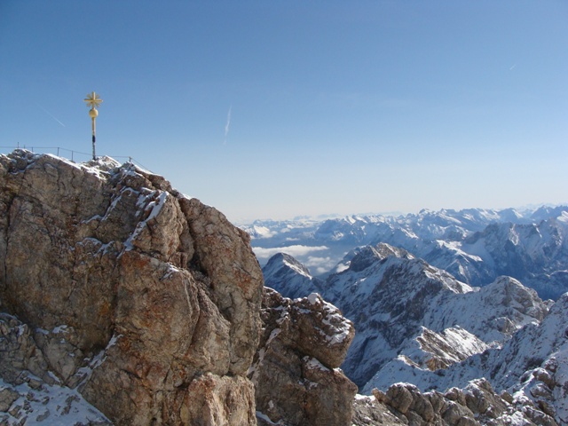 左側がドイツ最高峰ツークシュピッツェ(Zugspitze)の頂上になります。