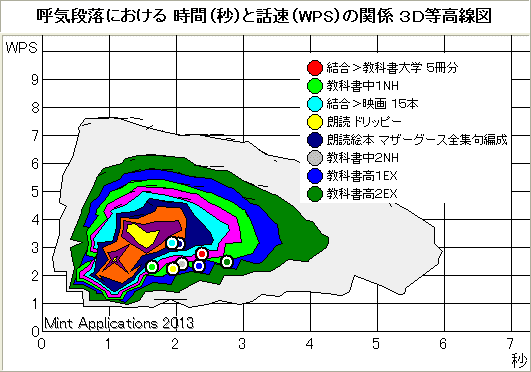 これに対し映画や物語の朗読などの呼気段落長は平均2秒程度で、中学2年程度と重なっている。ただし、話速は1秒間に3単語ほどと、中2の2単語の1倍半である。