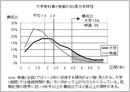 - この観点から大学教科書付属の音声CDと映画音声の特徴を解析したところ、興味深いことが明らかとなった。聴覚認知単位2秒前後を大きく越える3秒半以上の呼気段落の割合が映画では4%であるのに対して、大学教科書では13%ととても多かったのだ。今回の発表では「ネイティブ音声主導型チャンク音読」訓練の速読効果を理論とデータの両面から明らかにする。