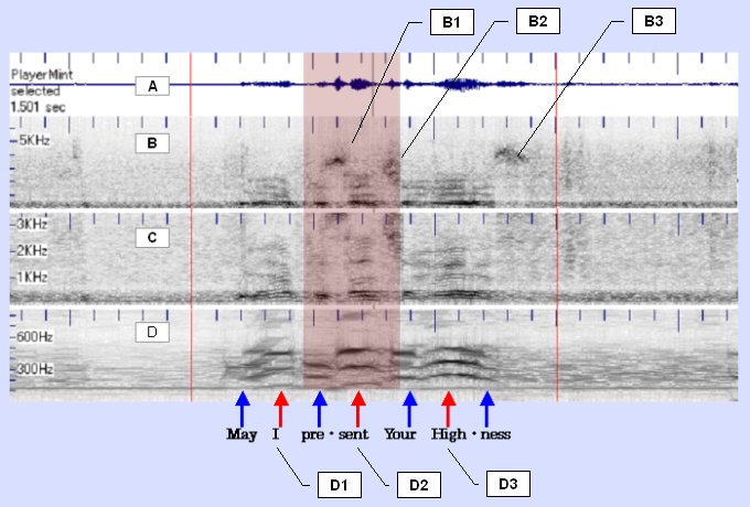 上からA, B, C, D の4つの解析図が描かれている。横軸は時間で左から右へ進む。左右の赤線の間が May I present Your Highness の音声に対応していて、D図の下に対応する単語(音節区切り)が記入してある。