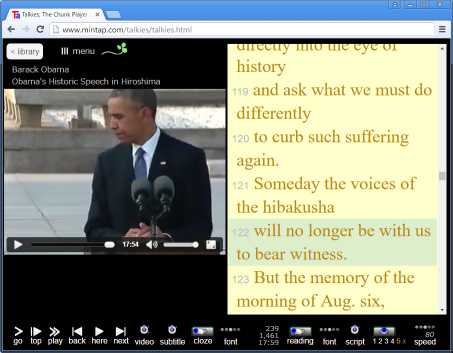 日英字幕つきチャンク再生ウェブ・プレーヤー・トーキーズのサンプル・ライブラリのトップにオバマ広島スピーチを登録したので、トーキーズにアクセスすれば、あとはスタートボタンを押すだけでいい。