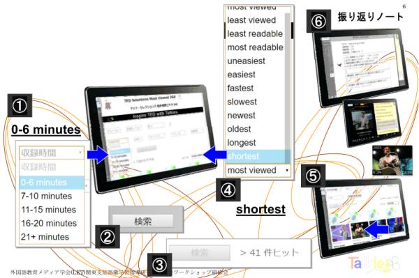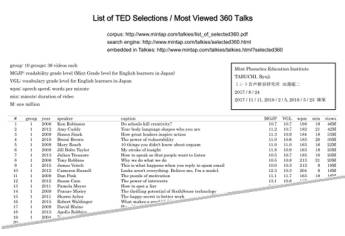 http://www.mintap.com/talkies/talkies.html?ted360 これを用いることにより、最も視聴されているTED Talks 360本の中から、リーダビリティ、語彙レベル、発話の速度の点でも絞りこめるようになった。ワークショップ当日では、コンピュータ教室にて、参加者が実際に操作しながら、開発者からの開発理念や秘話の紹介を予定している。時間があれば教授法について論議を深めたい。