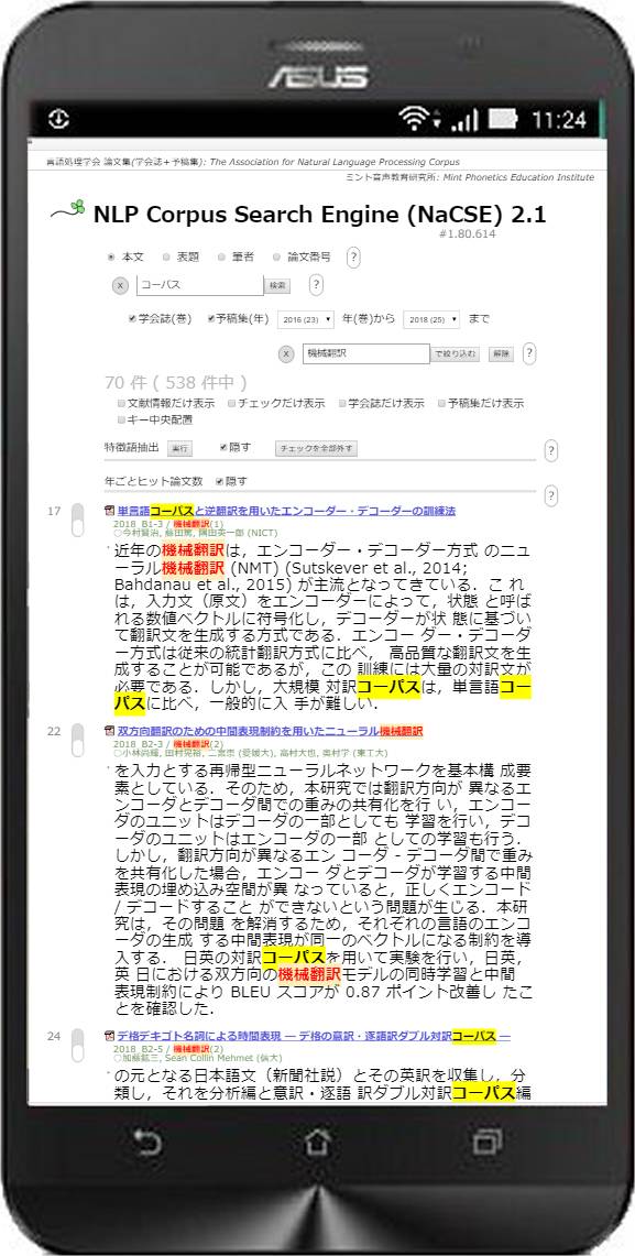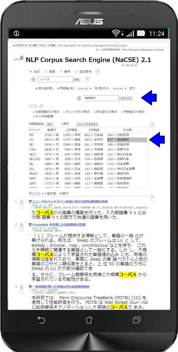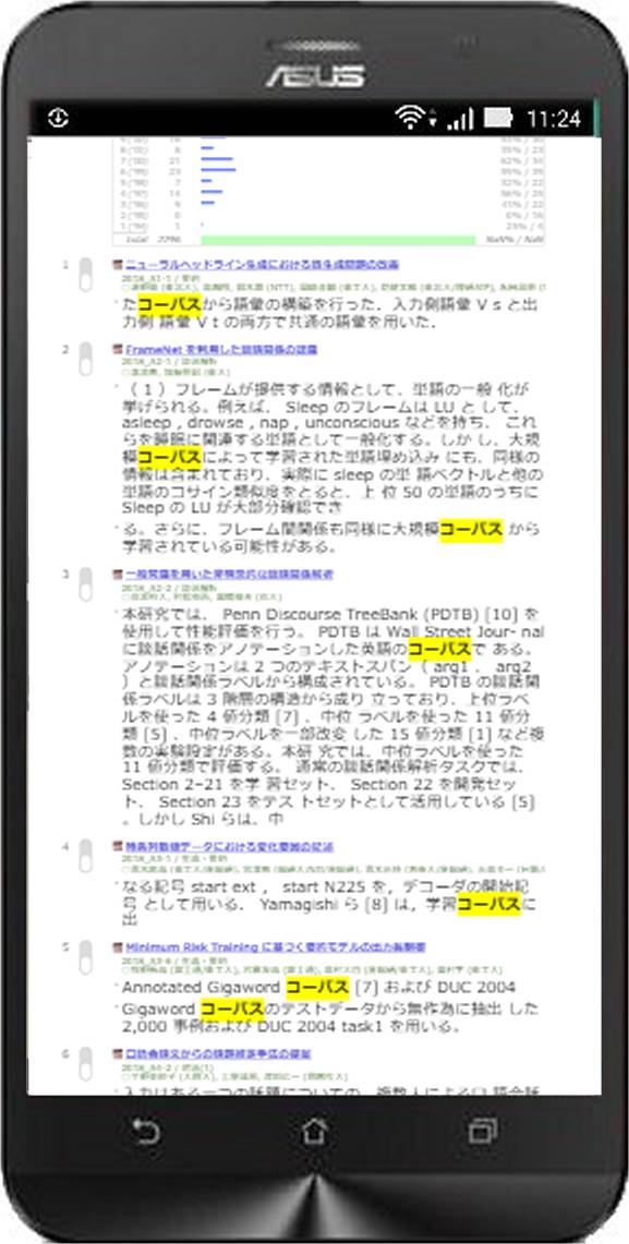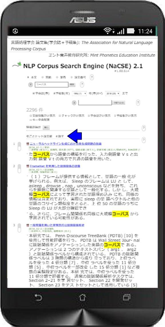 引用部分が、主検索語を中心にした1行に短縮される。これにより主検索語「コーパス」と副検索語「機械翻訳」との関わりを素早く確認できる。