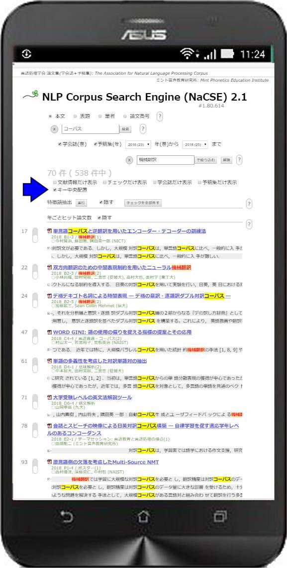 13. 検索語句が近い距離で共起しているものだけを素早く見つけたい時は、「キー中央配置」をクリックする。