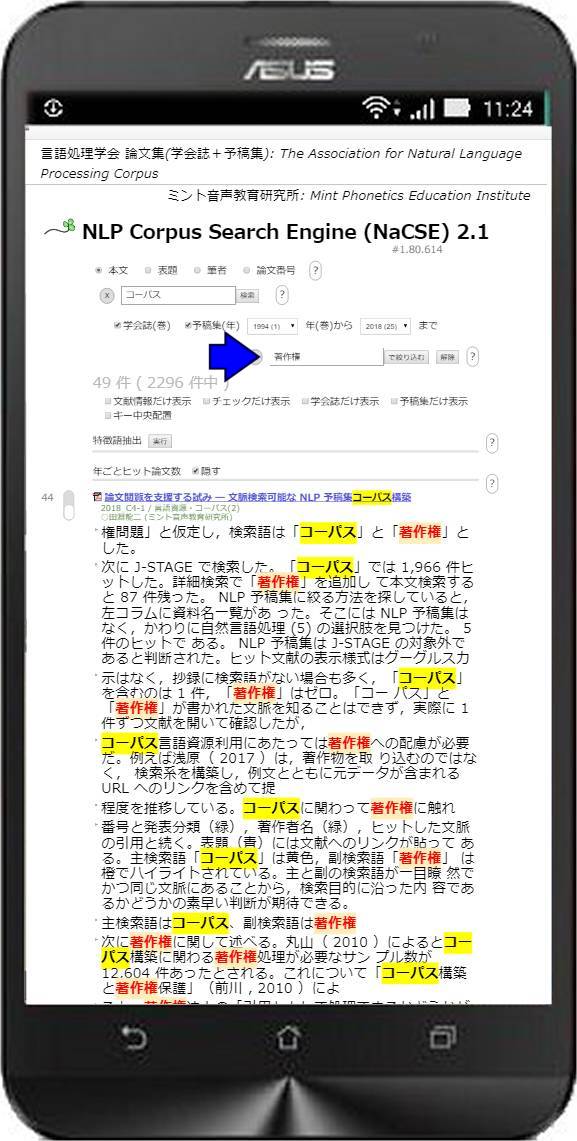 スマホで「コーパス」を検索した後、「著作権」で絞り込んだ様子とQRコード