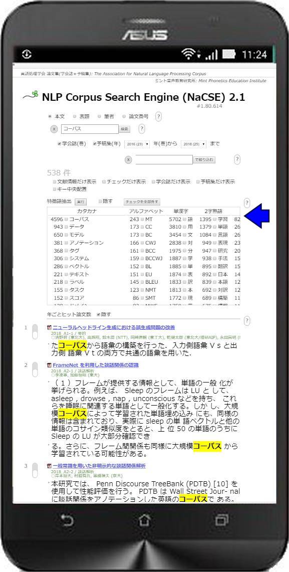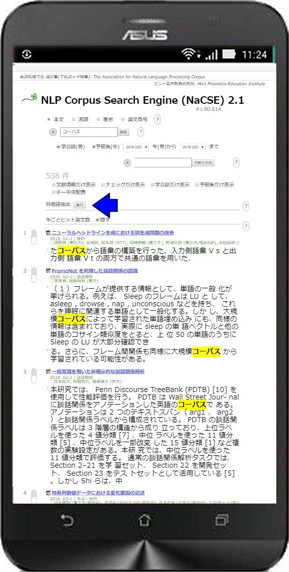 9. まずは主検索語「コーパス」で検索したあと、「特徴語抽出」ボタンをクリック。
