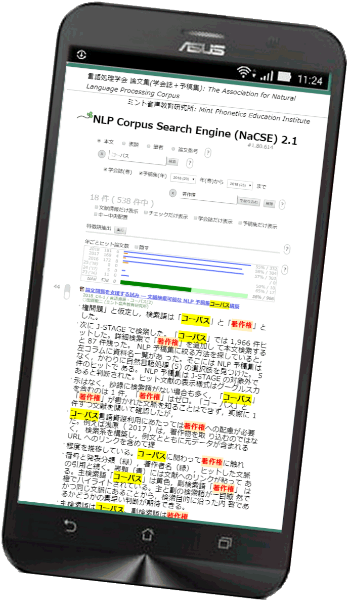 検索語が黄色でハイライトされ、検索語を含む文脈が段落(フレーズ)ごとに引用される。