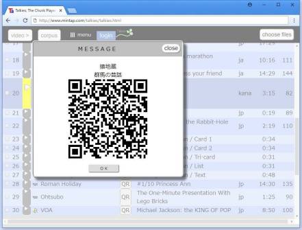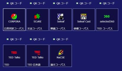 モニターやスクリーンに表示したコーパスまとめパネルのQRコードを使うと、キー操作の面倒がなく友だちや生徒が同じコーパスを開ける。一度開いたらブックマークしておくとよい。