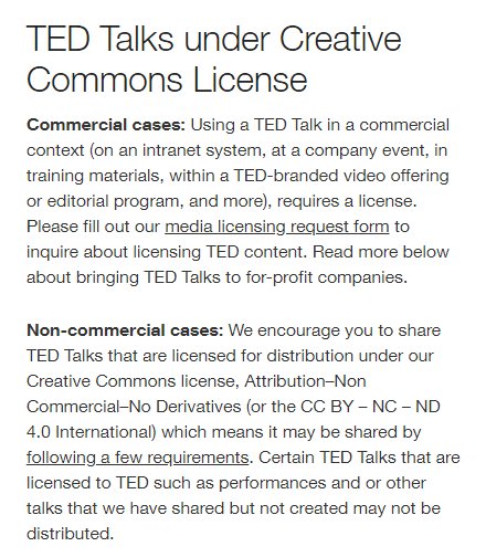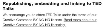 BY-NC-ND についての TED 自身による説明は 次のオフィシャル・ページにある。ただ、このページの記載は、CC NC(非営利)としつつ、その冒頭に Commercial cases: の項目が続くので、非営利を条件とした創造的活用を説明するのに営利の場合の対処法を最初に書いているのでわかりにくい。