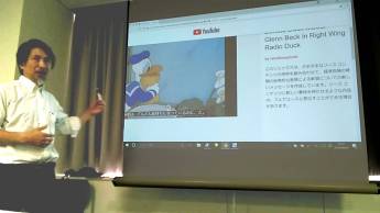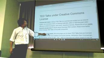 TED はクリエイティブ・コモンズを採用していて、 ビデオの自由で公正な利用を呼びかけていることを、 ⇒サイトの記事 を示して説明する田淵