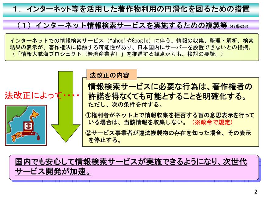 - 21世紀の到来とともに始まったGoogleやYahooの検索サービスは、日本では「著作権法違反」との認識が一般的であったが、日本政府は2009年になってようやく法整備にこぎつけた。この間の事情を示す文書が公開されている。詳しくは次々節 ⇒検索サービスと著作権