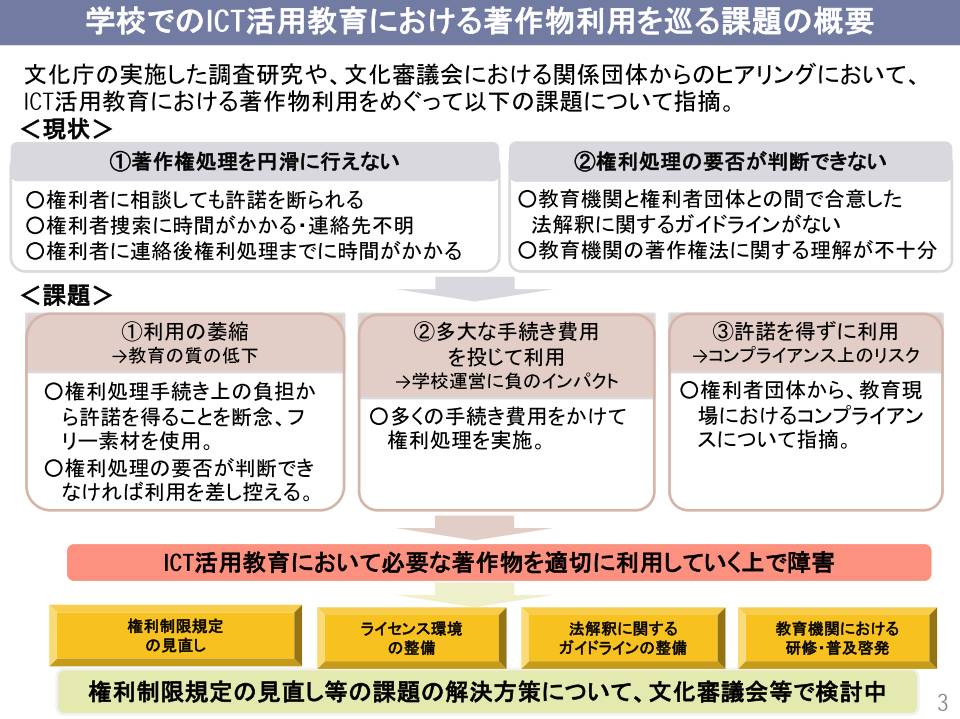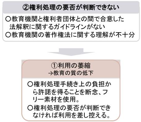 - 「 文化庁の実施した調査研究や、文化審議会における関係団体からのヒアリングにおいて、ICT活用教育における著作物利用をめぐって以下の課題について指摘 」 があったとし、 「 教育機関の著作権法に関する理解が不十分 」 という現状があり、著作物 「 利用の萎縮 」 が見られ 「 権利処理の要否が判断できなければ利用を差し控える 」 などによる 「 教育の質の低下 」 が問題にされている。