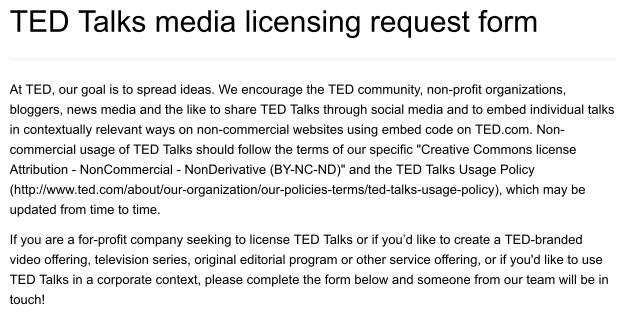 - TEDサイトには ⇒TED Media Request Form がある。商用で使いたいビデオを指定して送信する仕組みである。
