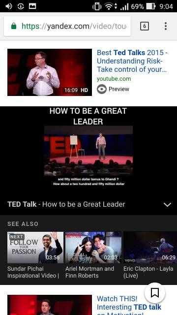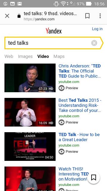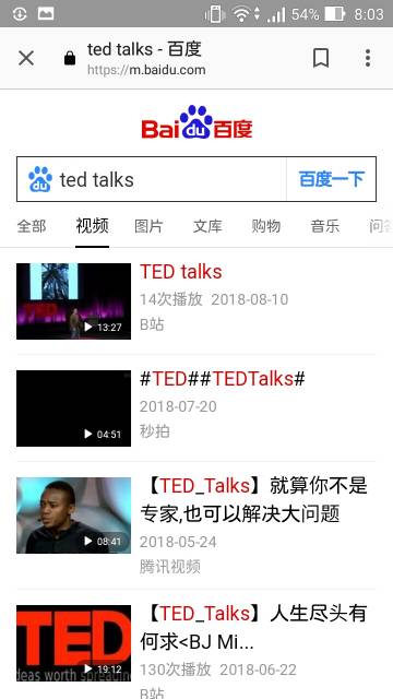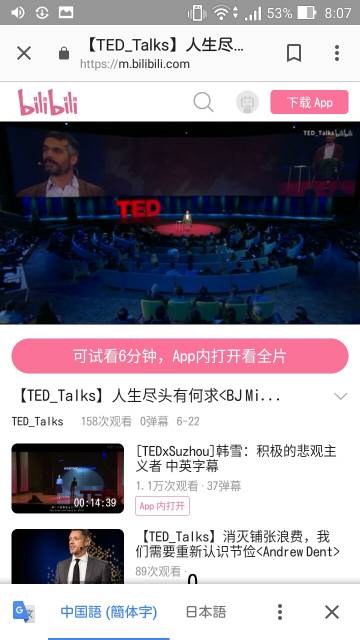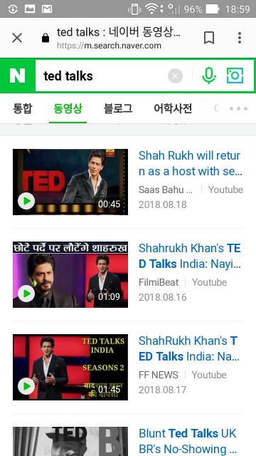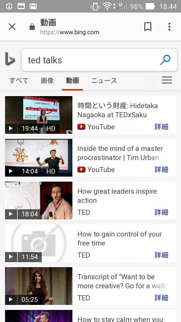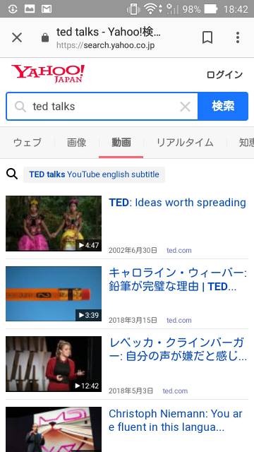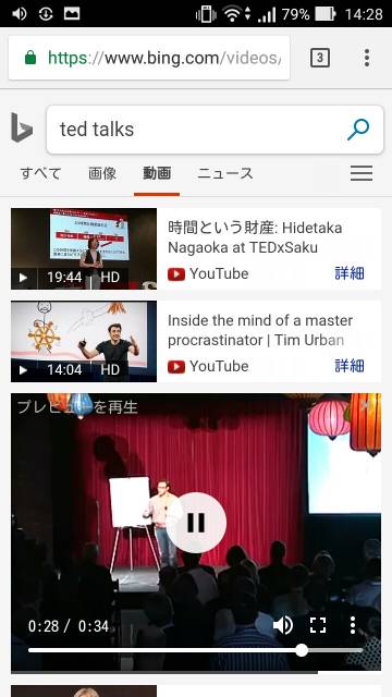 TED Talks をキーワードにスマホ(Android)で検索した後、表示を動画に切り替えた。
