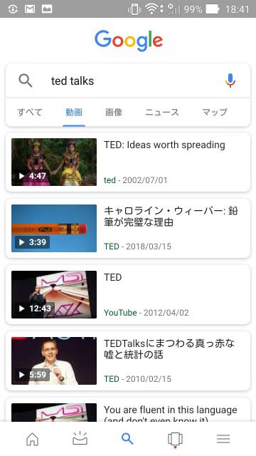 スマホの Google で TED Talks を検索した様子(動画モード)
