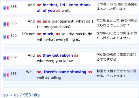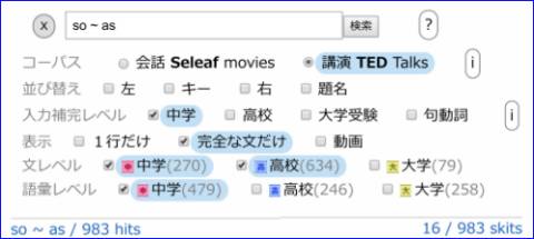 検索対象を TED コーパスにセットして so * as を検索すると、983件ヒットする。ただし、最初は100件だけ表示される。ここでは用例を網羅したいので全部表示させることにする。