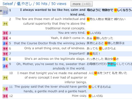 Seleaf コーパスで [ 優しい ] を引くと17件ヒットした。