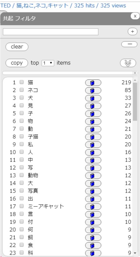 [ 猫 ] はどんな脈絡で 出てきたのか調べたいときには 共起フィルタが便利だ。共起フィルタは 対訳フィルタとセットで今年から導入したツールだ。