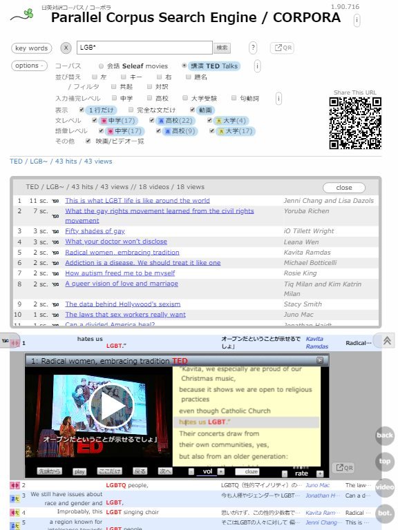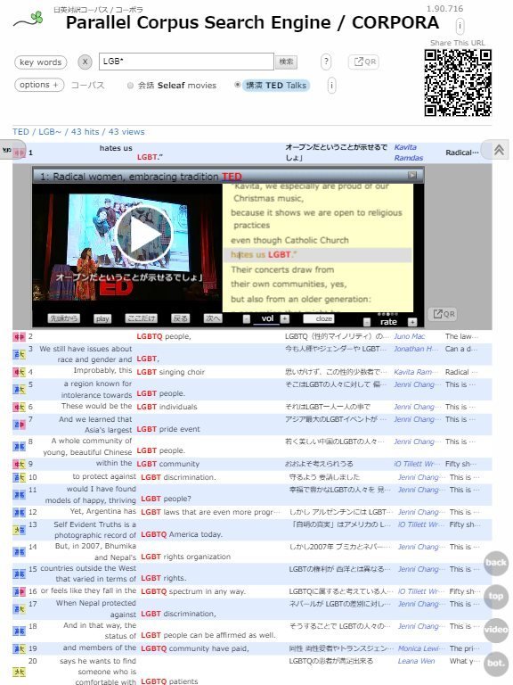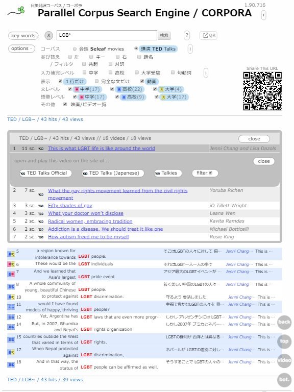 - CORPORA では 語彙として LGBT を含むものを検索してきているが、TED Talks では語彙 LGBT が示す文化領域に関連した Talks もヒットしている。