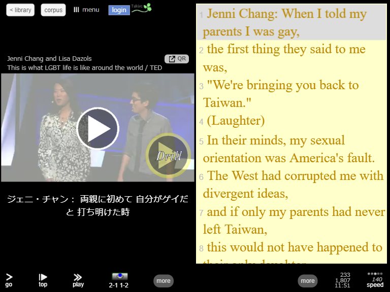 - TED Talk ごとにフィルターを通して 字幕を流し読みして