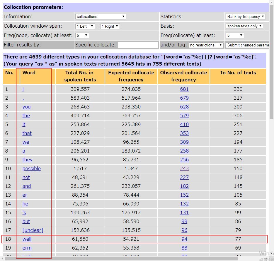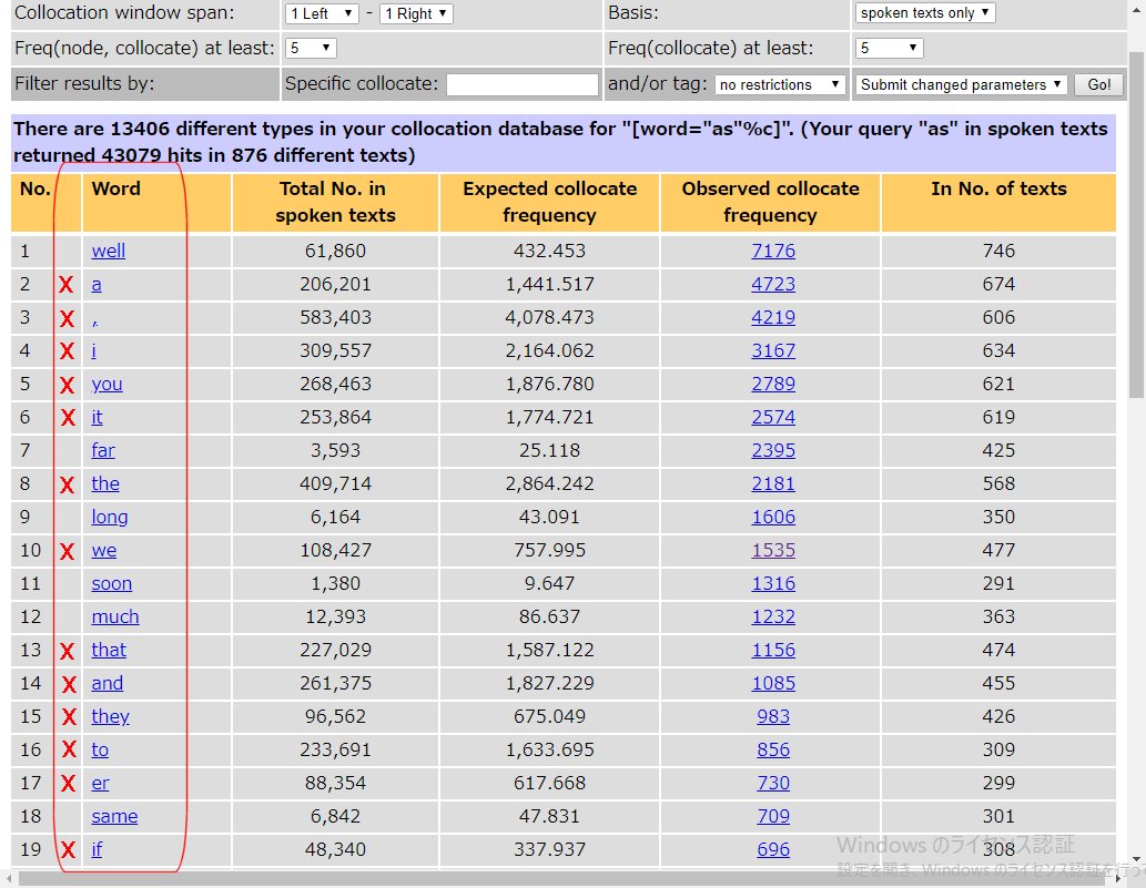 中央の青字部分のだけ、つまり as 〜 as の 〜 部分だけの統計処理ができればいいのだが・・・そうだ as だけで検索すれば何かあるかもしれない。