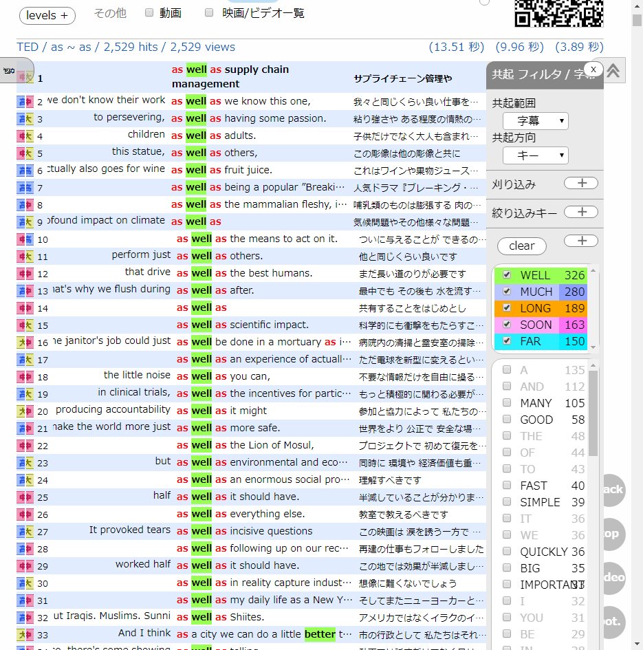 こちらは as 〜 as の検索で 〜 に語彙が1つだけに限定したので Seleaf や TED コーパス検索と条件(〜 には任意の数の語彙)が違うが、大きな傾向を知ることができた。