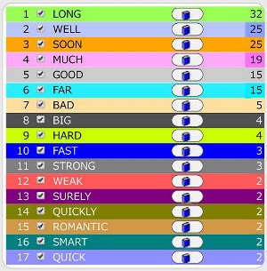最大が LONG で 32個、次が WELL で 25個、以下 SOON 25個、MUCH 19個、GOOD 15個と続く。その下に FAR 15個、BAD 5個が見えている。