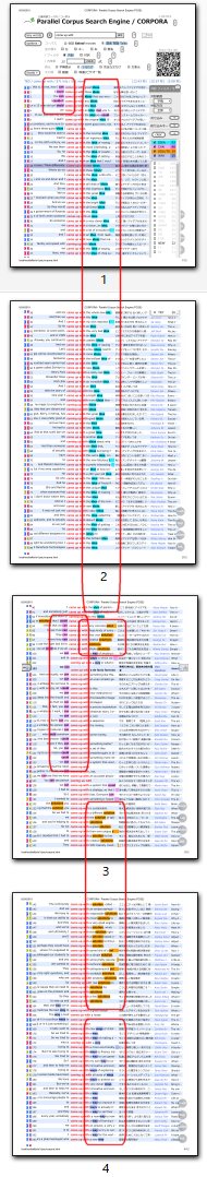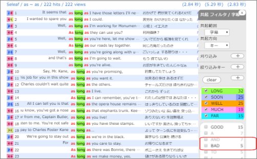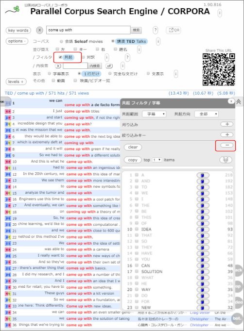 - 下に隠れた和訳を観たいときには 共起フィルタ小窓の「clear」の右にある「−」をタップする