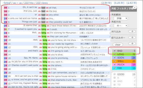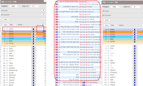 仲間入りした新しい単語は、彩色グループの最上位に移動する。と同時に、その単語を含む字幕も同様に彩色されて、字幕リストの最上部に移動する。